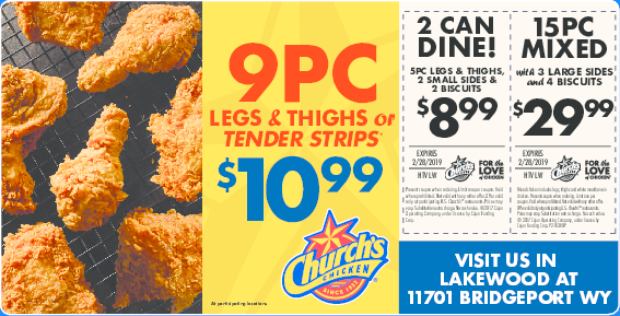 Church's Chicken Coupons, Promotions, Specials - October 2022 $9.99 Two Can Dine 5PC Legs And Thighs With 2 Regular Classic Sides & 2 Honey-butter biscuits. Coupon Code: 220307 ... Church's Chicken Coupon Fine Print. Like all things in life, there are limits to the coupon and promo codes. Not valid with any other coupons or offers. Valid only at participating restaurants.